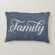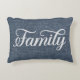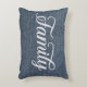 Pillow features the word 'Family' in a white decorative script against a casual blue faux denim background.
