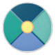 Decorative geometric teal greens and blues with a citrus orange and yellow circle in the centre