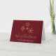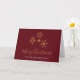 A Merry Christmas greeting card with an illustration of fancy golden snowflakes with elegant crystalline shapes. A dark red background. Personalised name on the front and peronalized message inside.