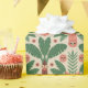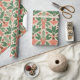 Decorative paper with a pattern of stylized green leaves and pink flowers on a white background, shown rolled and flat. Bright and lively design.
