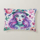 A bright decorative pillow with a Halloween-themed watercolor print. The centre of the composition features a witch with purple hair and a green hat, surrounded by festive elements: pumpkins, bats, potions, leaves, and flowers. This pillow will be a striking accent in your interior, create a festive atmosphere, and make a great unusual gift for Halloween.