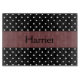 A decorative cutting board, this kitchenware features a black and white polka dot pattern background. In the centre is a eggplant coloured rectangle with a place to customise your name in lovely black font. Personalise your cooking board today!