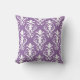 Decorative throw pillow with a purple damask pattern. Handmade in the USA. Large cotton pillow with a vintage damask design in white on a purple background.