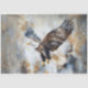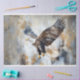 The image is a painting of a bald eagle in flight. The eagle is depicted with its wings spread wide, showcasing detailed feathers in shades of brown, white, and black. The background is an abstract mix of muted colours, including grey, beige, and white, which contrasts with the vivid depiction of the eagle. This image is interesting due to the dynamic portrayal of the eagle, capturing a sense of motion and freedom, and the artistic blend of realistic and abstract elements.