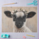 A lifelike lamb with black and white fur gazes softly forward, adorned with a delicate floral crown of pale pink and white blooms. Set against a neutral textured background, this expressive portrait blends rustic charm with whimsical elegance. Perfect for decoupage, spring journal covers, mixed media, or faith-inspired wall décor, it evokes innocence, renewal, and gentle storytelling—ideal for Easter crafting or devotional collections.