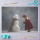 A heartwarming winter illustration featuring a young child in a red coat and matching hat, gently placing stick arms on a snowman. The snowman wears a brown knitted scarf and carrot nose, standing tall in a softly falling snow. The scene glows with innocence, seasonal joy, and the quiet magic of snowy day play. Perfect for holiday décor, whimsical storytelling, or nostalgic winter collections that celebrate childhood wonder.