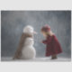 Child building snowman winter scene, red coat matching hat snow, carrot nose brown scarf snowman, gentle snowfall outdoor play moment, whimsical seasonal childhood illustration print, festive snowy day creative art, rustic snowman forest winter charm, joyful snow interaction holiday image, nostalgic winter storytelling kids artwork, cosy snow-covered ground vintage style.