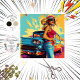 A stylised illustration of a person standing beside a classic car. The person is wearing a wide-brimmed hat, a red top, and denim jeans. The car has prominent tailfins and round headlights, indicative of vintage American automotive design. The background features abstract splashes of yellow, blue, and red colours, adding a vibrant and artistic touch to the scene