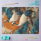 This elegant artwork features two graceful cranes perched atop a pine-laden branch, rendered in a richly stylised, East Asian-inspired aesthetic. The cranes have pristine white bodies, contrasting black necks, and striking red crowns—symbolising longevity and good fortune in many cultures. Behind them glows a large, vivid orange sun, anchoring the scene with warmth and balance. Wisps of swirling blue and beige clouds drift across a pale sky, creating a dreamy, almost ethereal atmosphere. The blue-green pine needles add texture and vibrancy, bringing the entire composition into harmonious focus. It’s tranquil, symbolic, and beautifully composed—a timeless nod to nature’s elegance.