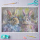 he image is a vibrant and colourful painting featuring two rabbits. Each rabbit wears a crown of flowers on its head, adding a whimsical touch to the artwork. The background is an abstract mix of splashes and strokes of various colours, including blues, purples, pinks, yellows, and greens, creating a dreamy and enchanting feel. The rabbits are depicted with realistic fur textures and expressive eyes, making the painting captivating and visually appealing.