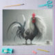The image shows a highly stylised and detailed illustration of a rooster. The rooster has elaborate and flowing plumage, with long, white feathers cascading down from its head and neck, contrasting with its dark body feathers. The rooster's comb is bright red, adding a striking pop of colour. The background is a gradient of grey tones, which helps to highlight the intricate details of the rooster's feathers and overall design. This image is interesting due to its artistic and exaggerated depiction of the rooster, making it visually captivating and unique.