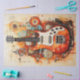 The image depicts an electric guitar with a striking orange and white design. It's centred against a dynamic, abstract background filled with vibrant geometric shapes, mechanical components, and bold splashes of colour, such as orange, red, blue, and yellow. The guitar features six strings, a white pickguard, control knobs, and a detailed bridge, blending realism with an artistic flair. The composition is bold, energetic, and visually captivating.
