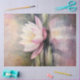 The image depicts a beautifully painted lotus flower in full bloom, floating on a serene water surface. The lotus has delicate petals with shades of white and pink, and the reflection of the flower is visible in the water below. The background is a soft blend of pastel colours, creating a tranquil and ethereal atmosphere. The painting captures the elegance and purity of the lotus, making it a visually captivating and calming piece of art.