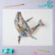 A unique sculpture of a dolphin covered in colourful graffiti. The graffiti features various words, symbols, and abstract designs in multiple vibrant colours. This artwork stands out by combining the natural form of a dolphin with the urban art style of graffiti, creating a visually striking and eclectic piece.