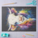This striking Highland cow portrait features a shaggy white cow with an expressive face, set against a dark and dramatic background. The fur is depicted with textured brushstrokes, giving a sense of depth and realism, while vibrant splashes of purple, yellow, blue, and green add an artistic flair. The paint splatters and dripping effects enhance the dynamic, energetic feel of the image, making it a bold and eye-catching statement piece.