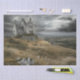 The image presents a historic stone ruin nestled atop a lush, grassy hill in Ireland. The remnants of the structure, perhaps an old castle or manor house, display weathered stone walls that have partially crumbled with time, hinting at its age and storied past. Surrounding the site are patches of wild vegetation, showcasing nature's quiet reclamation of the area. The setting opens into a vast, picturesque Irish countryside, featuring rolling green fields and dense woodlands. Overhead, an overcast sky with dramatic, moody clouds adds an atmospheric depth to the scene, enhancing its charm and mystery