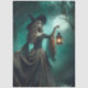 Mystical forest witch, Halloween fantasy art, glowing lantern witch, gothic enchanted forest, full moon witch scene, bats and fog background, dark fantasy illustration, tattered gown witch, supernatural Halloween decor, eerie forest magic