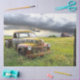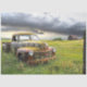 An abandoned rusty pickup truck rests in a pastoral field with vibrant green moss clinging to its surface, juxtaposed against barbed wire fencing and an old wooden barn under the impending threat of dark storm clouds. This evocative scene captures the essence of rural decay and the dramatic beauty of nature’s elements.