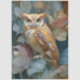 A stylised owl with expressive eyes and intricate brown-orange feather patterns sits among layered leaves in muted blue, green, and rust tones.