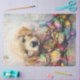 The image appears to be a watercolor painting featuring a golden retriever pup wrapped in colourful Christmas lights. The background is a mix of pastel colours with splashes and drips, giving it an abstract and festive feel. The dog, partially obscured by a blurred section, is the central focus, and the vibrant lights add a playful and warm touch to the artwork. This image is interesting due to its artistic style and the combination of a cute animal with holiday decorations, making it visually appealing and relevant for festive or holiday-themed content.