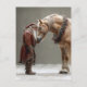 Celebrate the quiet magic of winter with this heartwarming illustration. Santa gently touches the face of a light brown horse adorned with a festive wreath of evergreens and berries.