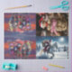 Bottom Left Section: This section depicts a winter scene with a person dressed in red riding a white horse through a snowy landscape. The person appears to be carrying a sack, suggesting a holiday or Christmas theme.