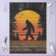 Sunset Bigfoot decoupage paper design, forest silhouette creature craft sheet, orange yellow sky journal cover, retro folklore themed media art, walking Sasquatch pine tree backdrop, RHDesigns exclusive mythical creature paper, wilderness sunset mixed media sheet, bold gradient sky forest design, legendary cryptid nature craft paper, stylized Bigfoot sunset scene art.