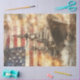 The American flag serves as a backdrop, its stars and stripes rendered with a weathered, artistic touch, contributing to the image's overall patriotic theme. The flag's colours, slightly desaturated and blended, give the impression of age and history, suggesting a timeless symbol of national pride.