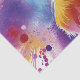 Surrounding the cow is a background of colourful splashes and splatter effects. The background colours are the same spectrum as those on the cow, providing a dynamic and lively backdrop to the subject. Dots and splashes of paint in various shades create a textured and almost abstract appearance alongside the cow