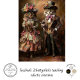 The image shows two anthropomorphic cats dressed in elaborate Victorian-era clothing. The cat on the left is wearing a floral-patterned dress with multiple layers of ruffles and lace, along with a large hat adorned with flowers and feathers. The cat on the right is dressed in a formal suit with a floral-patterned waistcoat, striped trousers, and a top hat decorated with flowers. Both cats have expressive, wide eyes and are posed in a manner reminiscent of a formal portrait. This image is interesting and relevant due to its whimsical and artistic portrayal of animals in human attire, blending elements of fantasy and historical fashion.