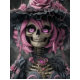 Channel gothic glamour and vintage mystique with this wildly captivating design. A skeleton figure, radiating charisma and edge, dons an elaborate Victorian ensemble—lace-trimmed dress, rose-laden hat, and glowing violet gemstone jewellery. Her lavender curls and luminous purple eyes break convention with fierce elegance, combining steampunk drama and fairytale rebellion.