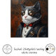 The image features a dashing male cat dressed in an elaborate, Victorian-style outfit perfect for Valentine's Day. The cat is wearing a white shirt with a high collar, a black waistcoat, and a black jacket adorned with intricate gold embroidery and a large, ornate brooch. He also has a red bow tie and a bell hanging from his neck, adding a touch of charm and sophistication. The background showcases a rich, dark, and ornate pattern, enhancing the luxurious and historical feel of the scene. This unique and whimsical image combines elements of historical fashion with feline charm, making it visually captivating and perfect for Valentine's-themed projects.