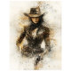 The image shows a stylised illustration of a beautiful cowgirl dressed in a Western-style outfit. She is wearing a wide-brimmed cowboy hat, a leather jacket with a bandolier of bullets across the chest, and a belt with a large buckle. She is holding a revolver in one hand. The background has a textured, artistic feel with a mix of light and dark tones, giving the image a vintage, rugged appearance. This image is interesting due to its detailed and artistic representation of a classic Western figure, evoking themes of the Wild West and cowboy culture.