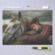 This touching scene captures a quiet bond between cowboy and horse, both resting together under a sombre sky. The cowboy, dressed in a red plaid shirt, brown gloves, and wide-brimmed hat, lies asleep in the grass, his back resting against the speckled white coat of his faithful horse. The horse stands calmly, head lowered near the cowboy in a posture that radiates watchful companionship.