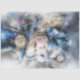 The image is an artistic depiction inspired by "Alice in Wonderland." It features a young girl, who we can assume is Alice, wearing a large blue bow and a blue hat adorned with a golden pocket watch. Her face is partially obscured, adding a sense of mystery to the image. Beside her is a white rabbit with blue eyes, holding a pocket watch. The background is a mix of abstract textures and colours, predominantly blue and white, with splashes of other colours. The overall style is whimsical and fantastical, capturing the essence of the "Alice in Wonderland" theme.