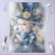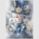 The image is an artistic depiction inspired by "Alice in Wonderland." It features a young girl, who we can assume is Alice, wearing a large blue bow and a blue hat adorned with a golden pocket watch. Her face is partially obscured, adding a sense of mystery to the image. Beside her is a white rabbit with blue eyes, holding a pocket watch. The background is a mix of abstract textures and colors, predominantly blue and white, with splashes of other colors. The overall style is whimsical and fantastical, capturing the essence of the "Alice in Wonderland" theme.