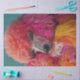 The image features a close-up of a poodle with its fur dyed in vibrant colours of pink, orange, and yellow. The poodle has prominent black eyelashes, giving the appearance of wearing makeup. The background is a solid teal colour, which contrasts beautifully with the bright colours of the poodle’s fur. This image stands out due to the unusual and artistic grooming of the dog, making it a striking example of creative pet fashion.