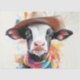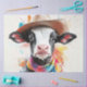 The image features a digitally illustrated cow wearing a cowboy hat and a colourful scarf. The cow's face is prominently displayed, with large ears and expressive eyes. The background is filled with splashes of various colours, giving the image a playful and artistic touch