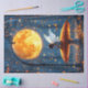 Discover the enchanting scene of a fairy with delicate wings sitting on a glowing orange mushroom. Set in a dark, magical forest with a bright full moon and floating orbs of light, this whimsical artwork captures a serene and otherworldly atmosphere perfect for fantasy lovers and art enthusiasts.