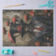 The image depicts a surreal and somewhat eerie scene featuring a figure wearing a tall, tattered top hat with a red band. The figure's face is obscured, adding to the mysterious atmosphere. The figure is dressed in a worn, dark suit with a tie, and is surrounded by large, red-capped mushrooms with white spots, which appear to be growing out of the ground and even from the figure's clothing. The background is a mix of earthy tones with dripping paint, giving the image a dreamlike and slightly chaotic feel. The combination of the mysterious figure and the oversized mushrooms creates a fantastical and intriguing visual.