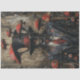 surreal art, eerie scene, tattered top hat, red band, mysterious figure, dark suit, red-capped mushrooms, white spots, dreamlike atmosphere, chaotic background, fantastical visual, intriguing scene