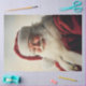 This is a creation of digital art of a photo that features Santa Claus in his classic red suit, beaming with excitement as he prepares to deliver toys to children. The background is a warm cream colour adorned with twinkling lights, adding a touch of festive magic to the scene. Santa's joyful expression and the enchanting ambiance capture the true spirit of Christmas.