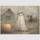ghost in pink floral hat, rustic autumn barn scene, whimsical farmhouse Halloween decor, vintage harvest ghost design, cow and pumpkin fall art, surreal rural Halloween aesthetic, floral ghost country charm, corn stalks and barnyard whimsy, cosy spooky season illustration, playful ghost rustic landscape