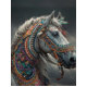 This image features an exquisitely adorned white horse, radiating regal elegance and ceremonial beauty. Its coat gleams beneath a moody, cloud-laced sky, creating a powerful contrast that draws the eye to its vibrant embellishments. The horse is lavishly decorated with intricate harnesses and bridles featuring rich embroidery, shimmering beads, and ornamental feathers. Jewel-toned accents in red, gold, and turquoise lend a majestic, almost mythical quality. Its flowing mane is impeccably groomed, contributing to the creature’s dignified presence. Altogether, it evokes the grandeur of royal parades, sacred rituals, or fantasy celebrations steeped in tradition and artistry.