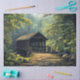covered wooden bridge, lush green forest, red shingled roof, clear stream, sunlight filtering, dense canopy, dappled light, vibrant foliage, serene atmosphere, rustic charm, peaceful solitude, natural setting, scenic bridge, tranquil nature.