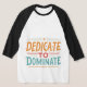 The t-shirt design features the text "Dedicate to Dominate" in a bold, multicolored font. The colours are vibrant and contrasting, creating a dynamic and eye-catching effect. The text is arranged in a playful and energetic pattern, with the letters overlapping and intertwining. The overall design is both motivating and empowering, encouraging the wearer to strive for greatness and achieve their goals.