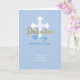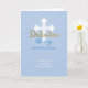 Blue background sets off the white cross and rays. Digitally rendered word Dedication stands out for this religious dedication card for a boy.