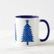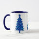 Mug in a classic silhouette of a Christmas tree in dark sapphire blue, patterned with satin textured stars in aqua and ice blue