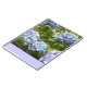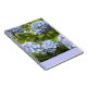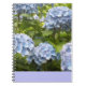 Deep blue hydrangeas nestled among bright green leafy foliage. A border of lighter blue along the bottom of book.