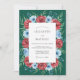 A vibrant arrangement of deep red roses and delicate blue blossoms forms a lush wreath. Verdant foliage and leafy accents create an abundant, romantic feel, perfect for a classic celebration.